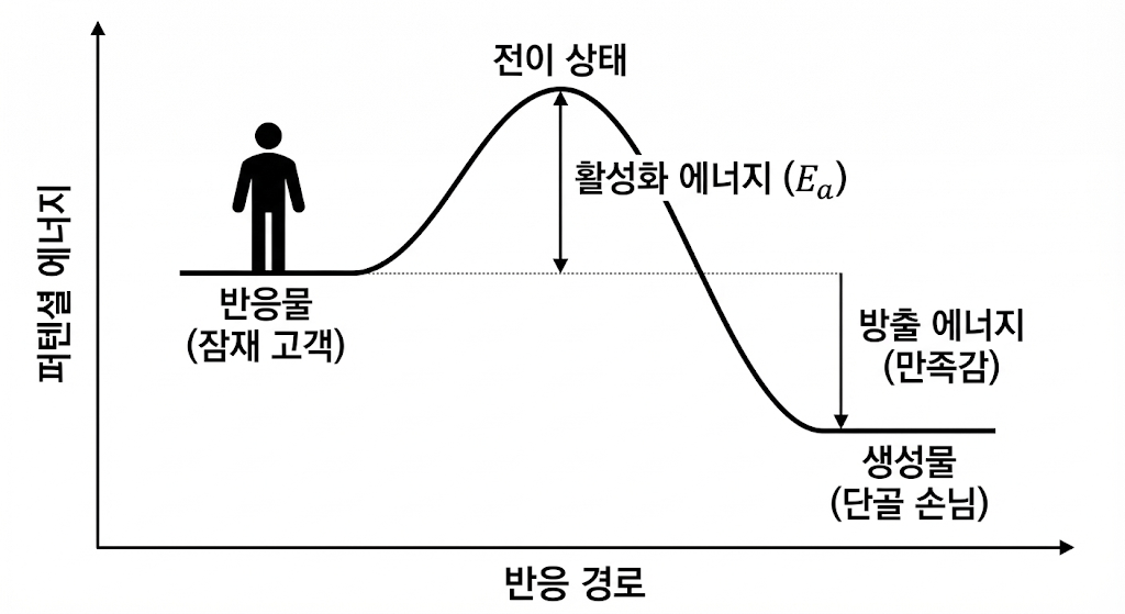 당신이 작은 카페를 차렸다고 가정해 봅시다. 당신은 어떻게 임의의 사람을 당신의 손님으로 바꾸고, 그 손님을 떠나지 않게 만들 수 있을까요? 이번 글에서는 이 과정을 화학 반응의 ‘활성화 에너지’와 ‘퍼텐셜 에너지’의 관점에서 풀어보려 합니다.